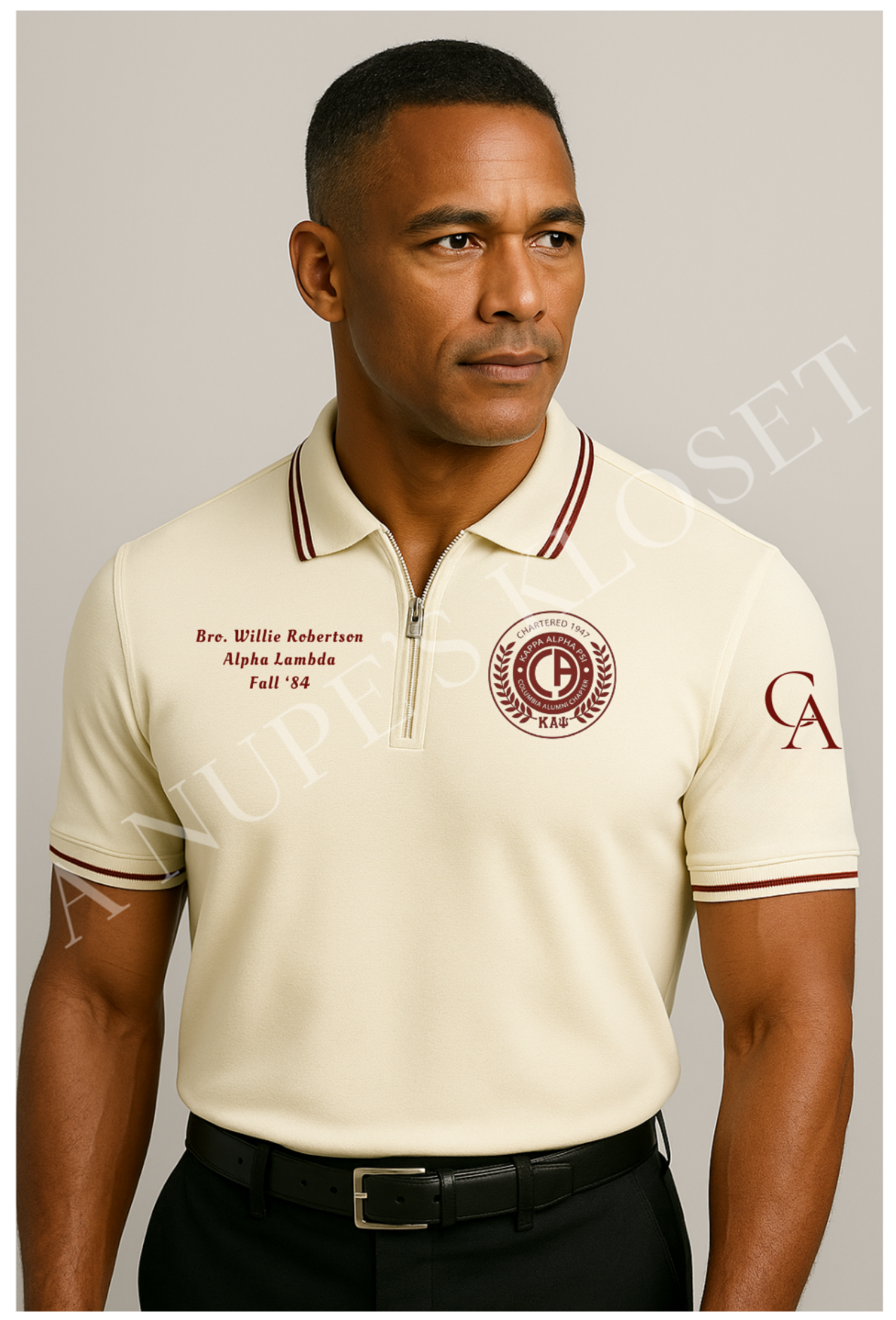 Step out in refined fraternity style with this exclusive Columbia (SC) Alumni Chapter polo, crafted with pride for members of Kappa Alpha Psi. This custom-designed kream polo features rich krimson embroidery, including your personalized name and chapter of initiation — a powerful statement of brotherhood, legacy, and class.